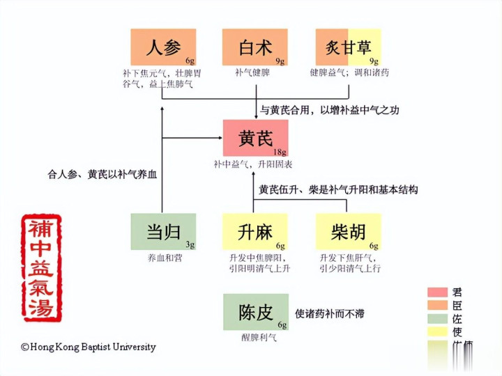 补中益气汤出自李东垣的《内外伤辨惑论》,方子里用到黄芪,甘草,人参、升麻、柴胡、橘皮、当归身、白术,整体思路非常清晰,就是“补中气、举清阳”。
